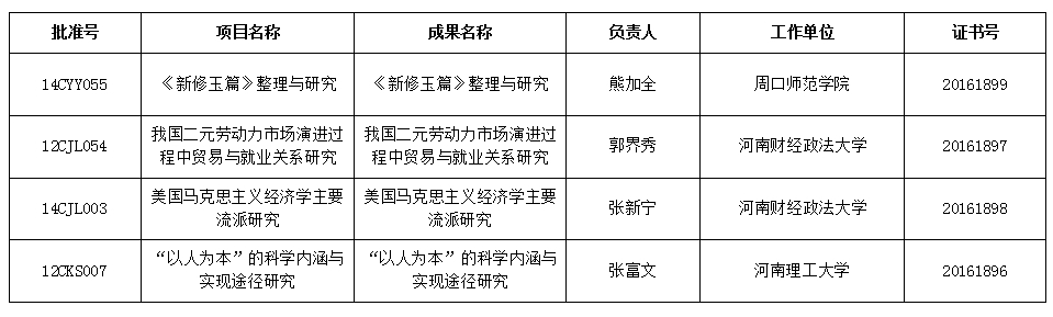 2016年11月河南省国家社科基金年度、青年和西部项目结项情况