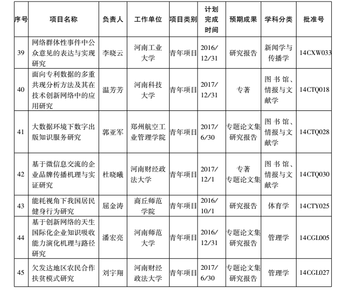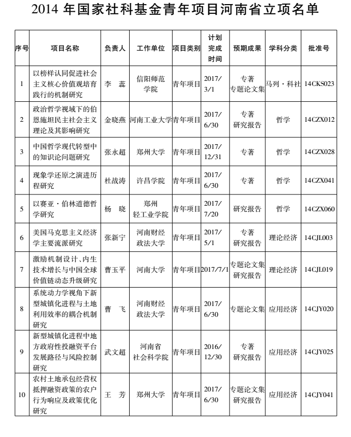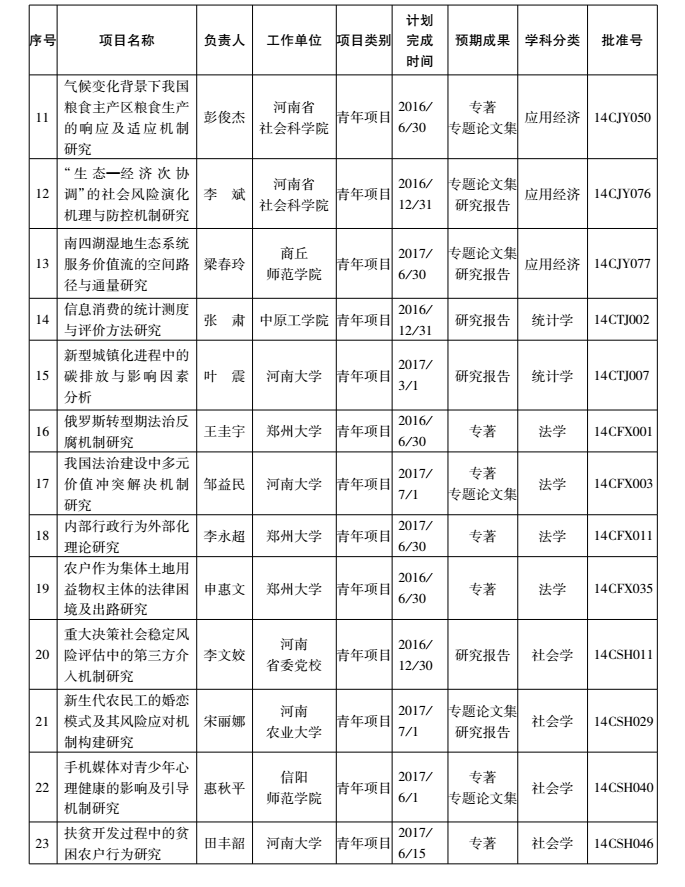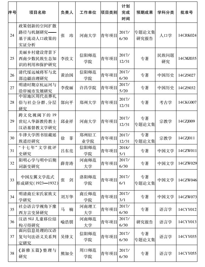 2014年度国家社科基金青年项目河南省立项名单