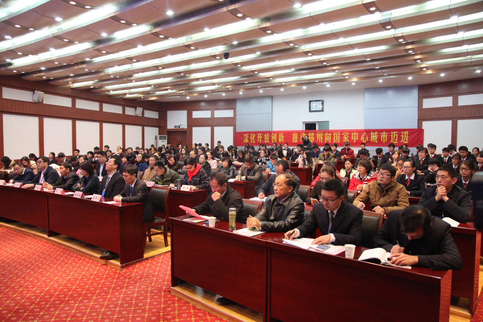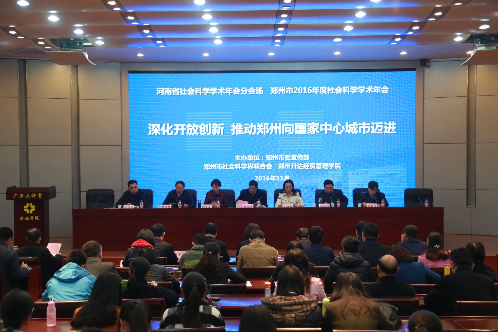 为了深入学习贯彻习总书记系列讲话精神和市十一次党代会精神,更好地发挥社科工作对郑州经济社会发展的推动作用,为市委、政府科学决策提供智力支持,为广大社科工作者搭建研讨交流平台,推动郑州经济社会快速发展,2016年11月1日上午,由新利指定网站官网网页版入口、郑州市社科联联合举办的“郑州市2016年度社会科学学术年会”在郑州升达经贸管理学院隆重开幕。本届社科学术年会会期两周,主题为“深化开放创新 推动郑州向国家中心城市迈进 ”。会议期间将举办综合研讨会、专题研讨会、学术报告会以及社科成果普及宣传交流展示等相关系列学术活动。省、市有关部门领导及专家学者、高校科研处、市社科学会、协会、研究会等方面社科工作者200余人参加了开幕式和首场研讨会。