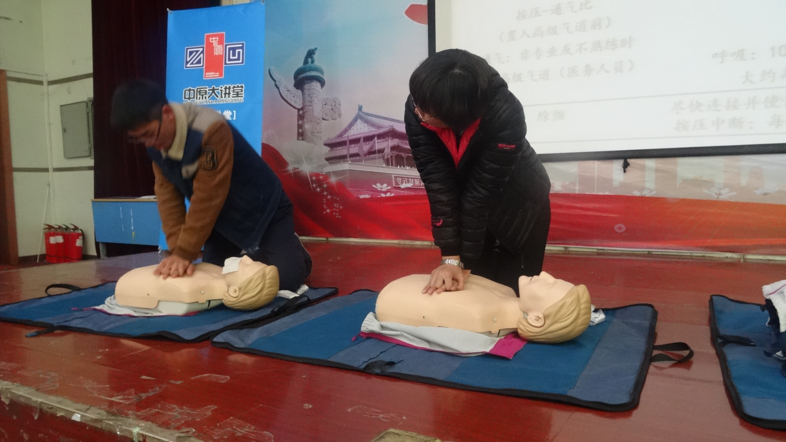 李教授分别从休克和心脏骤停的差别、现场急救技术要点、心肺复苏技术要点及操作方法等方面进行了详细地讲解,结合人体模型,亲自示范如何启动EMS(紧急救援系统) 、清理口腔异物、心脏按压、开放气道&人工呼吸,并和参与互动的学生共同模拟实施病人心肺复苏急救示范演练,让在座的大学生两两进行亲身体验,提高了学生的积极性和参与度。