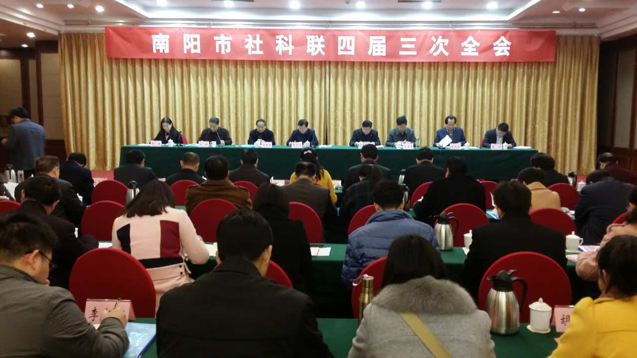 此次会议共有四项议程:一是改增选主席、副主席。二是石峰同志代表四届委员会做工作报告。三是宣读南阳市第九届优秀青年社科工作者表彰决定和2016年度全市社科工作先进单位和先进工作者表彰决定。四是南阳市委常委、宣传部长张富治同志发表讲话。