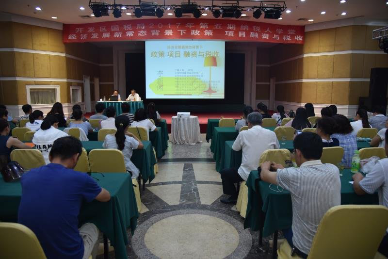 7月19日下午,驻马店市天龙大酒店五洲会厅坐满了前来听取讲座的国税局系统企业负责人。驻马店市文化产业学会理事长、宁夏大学特聘教授李新文应市经济开发区国税局邀请,为大家进行《经济发展新常态背景下政策项目融资与税收》专题辅导。据悉,这是市经济开发区国税局利用税收大讲堂,有针对性为企业排忧解难,帮助企业发展壮大的创新之举。