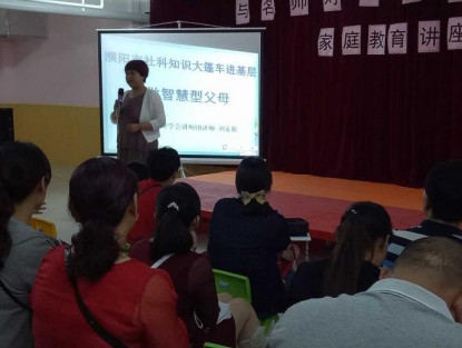 5月13日,濮阳市社科知识大篷车来到北京金口才学校濮阳分校举办家庭教育公益讲座,邀请国家二级心理咨询师、濮阳市社科普及讲师团成员、濮阳市心理学会讲师团讲师刘素格登台,做了题为《怎样做智慧型父母》的精彩讲座。濮阳市社科联普及部部长李中坤、濮阳幼师学校校长张中华参加讲座。来自濮阳市实验小学、濮阳市第二实验小学的学生家长和市民50余人聆听此次讲座。