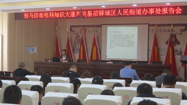 4月26日上午,驻马店市社科知识大篷车邀请驻马店职业技术学院招生就业处副处长、副教授魏耀辉,到驿城区人民街道办事处为150余名干部群众举办了一场《人生智慧之情商与阳光心态》专题报告。人民街道办事处主任王玉萍同志主持会议。