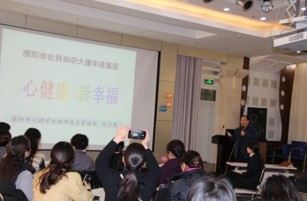2017年3月8日上午,濮阳市社科知识大篷车开进中原油田,为中原石油勘探局机关党委、局妇联、局团委、油地工作处等九个部门的女同胞奉献了一堂精彩的心理健康和家庭幸福公益讲座。濮阳市社科联普及部部长、濮阳市心理学会讲师团名誉团长李中坤以《心健康 新幸福》为题,从四十岁的人生感悟讲起,与大家分享了“幸福靠珍惜现在,机会靠懂得感恩,成功靠贵人相助,未来靠自己打拼”的人生经验,提出了“家是人生幸福之源”的明确观点,从“幸福,需要共同创造;幸福,需要用心呵护;幸福,需要乐观向上;幸福,需要家庭美德;幸福,需要礼尚往来;幸福,需要广结善缘;幸福,需要幽默风趣;幸福,需要天长地久”等八个方面讲述了建设幸福家庭的经验。最后,李中坤用一首自己创作的小诗给此次讲座做了总结:“家中小菜胜大餐,暖心私语爱无边,乐学乐活乐工作,父慈子孝妻娇贤,高朋满座多雅士,善心善言结善缘,多姿多彩多趣味,我爱国家一万年。”精彩的演讲赢得大家阵阵掌声。