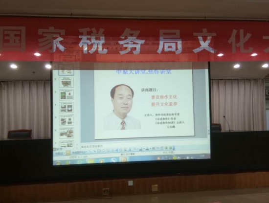5月18日,中原大讲堂·焦作讲堂走进国税系统。焦作市优秀社科专家、民间文艺家协会副主席王先鹏同志为焦作市国税局机关干部解读焦作文化。