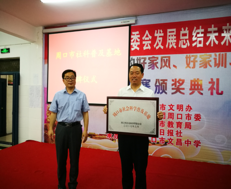 王启辉副主席讲话指出,为进一步拓展社科普及载体,整合社科普及资源,推进社科普及工作的社会化、公益化、常态化建设,周口市社科联授予周口市文昌中学“周口市社科普及基地”称号。希望周口市文昌中学充分利用和发挥学校资源优势和普及条件,在普及社会科学知识“进机关、进农村、进企业、进学校、进社区”等方面发挥更大作用,为提升我市社科普及水平,推动周口市社科事业的发展和繁荣作出更大的贡献。