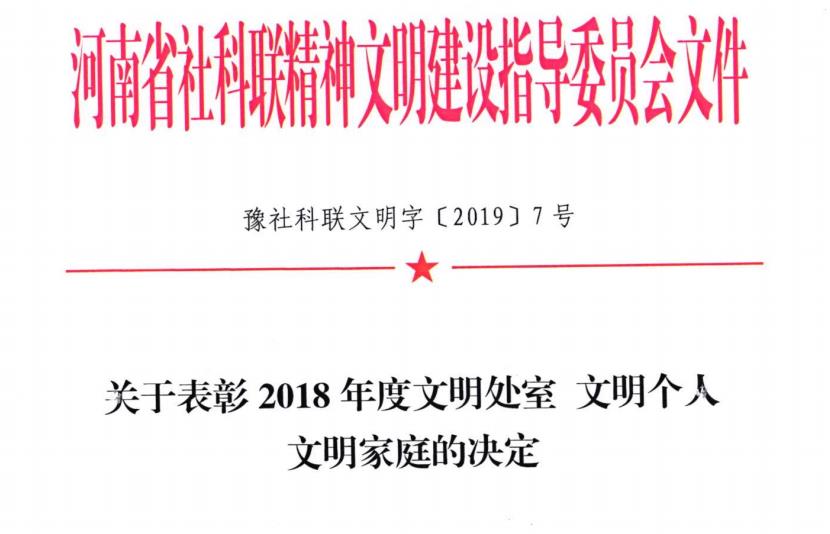 豫社科联文明字〔2019〕7号 关于表彰2018年度文明处室 文明个人 文明家庭的决定