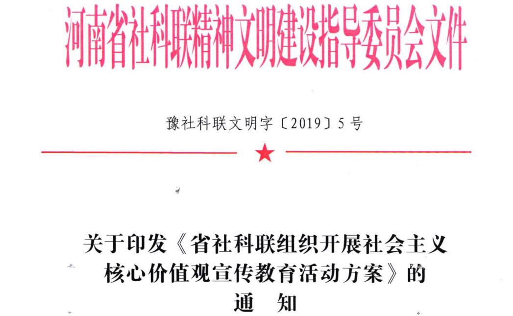 豫社科联文明字〔2019〕5号 关于印发《luck18(中国)体育组织开展社会主义核心价值观宣传教育活动方案》的通知