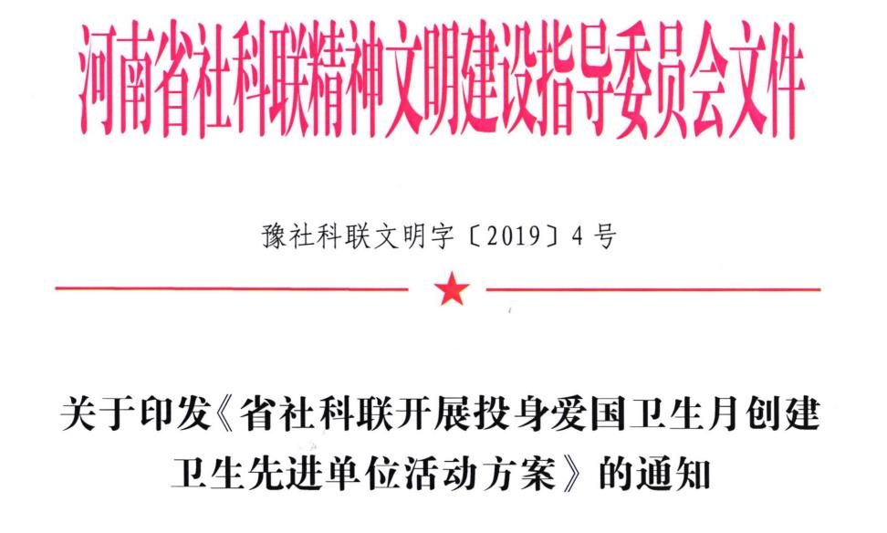 豫社科联文明字〔2019〕4号 关于印发《luck18(中国)体育开展投身爱国卫生月 创建卫生先进单位活动方案》的通知