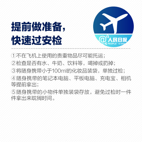 ①不在飞机上使用的贵重物品尽可能托运;②打火机、火柴不能带,酒类刀具要托运;③水、牛奶、饮料等喝掉或扔掉;④将随身携带小于100ml的化妆品装袋,单独过检;⑤零碎小物品装袋存放;⑥随身携带的笔记本电脑、平板电脑、充电宝、相机等提前拿出,单独过检。